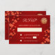 Le cerisier rouge fleurit sur un arrière - plan rouge chatoyant et un double symbole de bonheur doré. Carte Mariage chinoise RSVP. À l'arrière se trouve un code qr scannable pour votre site mariage.