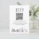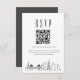 Une carte de code rsvp QR minimaliste de mariage avec un skyline stylisé représentant la belle ville de Charleston, Caroline du Sud. Remplacez le code QR par un lien vers votre site Web pour faciliter la réponse à votre événement mariage pour vos futurs invités.