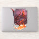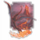 Epic fantasy art features a red dragon breathing a stream of fire while a volcano spews magma in the distance. By Paxdomino