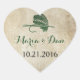 L'autocollant Rustic Fishing Mariage date a un arrière - plan de parchemin brun et un leurre de pêche verte. Noms des mariées et des mariées et date du mariage sur le devant.