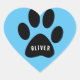 Sticker Coeur Empreinte de patte bleu avec nom. L'autocollant présente un empreinte de patte de chien noir portant un nom sur un arrière - plan bleu. Personnalisez le nom avec le vôtre.