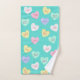 Ce joli ensemble de serviettes est décoré sur le thème de la Saint-Valentin. L'arrière - plan est recouvert de bonbons de coeur Valentin classiques. Les bonbons colorés sont assortis de différents discours. La serviette de bain comprend un arrière - plan rose vif, la serviette de bain un arrière - plan turquoise ou aqua, et le linge un arrière - plan violet violet.