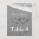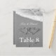 Coeurs dans le sable carte numéro de table pour le dîner de réception | Plage à thème. Image photo en noir et blanc avec coeur romantique sur la côte. Coeurs entrelacés tirés dans le sable. Idéal pour rappeler votre mariage maritime ou de plage. Nom du marié et du marié personnalisable avec un texte de script élégant.