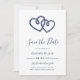 Notre mariage d'été chic côtier sauvez les cartes de date disposent d'un style nautique classique en marine et blanc. Une paire de coeurs ouverts entrelacés formés d'une corde nautique nouée apparaît en haut, avec "save the date" sous la typographie de script moderne. Personnalisez avec votre enregistrer les détails de la date dans un combo chic de lettres serif et sans serif. Parfait pour les mariages nautiques, d'été ou de plage. Enregistrez les cartes de date à l'envers sur un motif de corde blanche en boucle sur bleu marine.