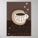Delicious poster for any coffee lover. The word, "coffee," makes the shape of a mug and hearts are floating around ripples of mocha, latte, cappuccino, macchiato, espresso, and americano.