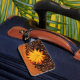 Name tag with a photograph in warm tones with coffee beans and a yellow daisy tinted with orange on a wooden background.