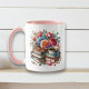 A really pretty ai watercolor illustration of a a stack of vintage books, a cup of tea or coffee and pretty flowers coffee cup.