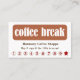 Keep your coffee customers coming back with this cute discount loyalty card. The front of the card has a brown sign with white typography that declares "coffee break". There are 2 text fields for you to customize, plus a punch out or mark off number series at the bottom ending with a red star. The back of the card is white, with more custom text fields. This card may be easily adapted to a cafe or any establishment that sells coffee beverages.