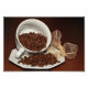 Send a hello with this photograph of a white coffee cup and saucer with coffee beans spilling out.
