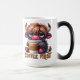 A funny and sarcastic design showcases a cute highland cow holding a to-go coffee cup brimming with coffee. With big blue eyes and a sleepy, tired expression, the cow rests its head on the cup's lid, its fluffy black fur adding to the charm. The colorful text reads, "Coffee first." This playful design is available on a wide variety of products, making perfect gifts for coffee lovers.