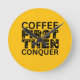 Kickstart your day with this bold yet simple Round Clock that speaks to every coffee lover! Featuring clean, sans-serif typography and a sleek monochromatic palette, the "Coffee First, Then Conquer" T-shirt is perfect for those who believe in starting their day with caffeine and confidence.