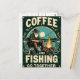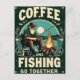 A retro-style illustration featuring a fisherman sitting by a campfire with a fishing rod and a cup of coffee, with the text Coffee & Fishing Go Together displayed prominently.