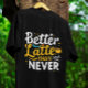 Start your day with humour and style! This bold typographic design features the quote "better latte than never ” on a sleek black background. Perfect for coffee lovers, it blends fun vibes with modern style. A funny coffee gifted idea and a coffeeful shirt funny must-have!