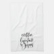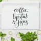 Our custom kitchen towel adorned with with the words "Coffee Lipstick & Jesus" in black and white. View our full line of products in our Zazzle store.