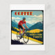 You can ride your bike over high mountains because of coffee and coffee alone. This great design shows a cyclist in the mountains in the style of a retro vintage travel poster.