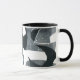 A white ringer mug with a black lip and handle and an abstract design in grey, black and white, from a screenprint by Judy Adamson.