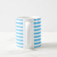 This ceramic coffee mug is shown in basic but stylish bright blue and white with stripes print.