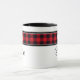 This ceramic coffee mug is shown with a cute black and red buffalo plaid print and two black accent stripes. Text of "All Mine" in coordinating colours on both sides of this mug.