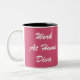 Two-toned coffee or tea mug in pink and white with the saying "Work at Home Diva" for the woman who makes a living at a work at home job as a freelancer or employment company.