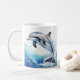 This coffee mug features an intricate and beautifully detailed design of a playful dolphin jumping out of the water. The colors used in the design are vibrant and eye-catching, with shades of blue, gray, and white being the predominant colors.