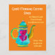 A flyer suitable for a coffee shop or cafe shop, or grand opening featuring cute and colorful retro teapot cafe tea illustration against a gray background.Cute, colorful and retro. All text is fully customizable to suit your needs.