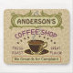 This coffee-themed mousepad is perfect for anyone who runs their own coffee shop or has a coffee theme in their home kitchen decor. Done in retro brown, green, purple and hints of orange, this espresso / cappuccino inspired design features a cup on a saucer, two personalized text banners and the words "Coffee Shop / Fresh Roast / Great Flavour" in purple.