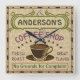 This coffee-themed square wall clock is perfect for anyone who runs their own coffee shop or has a coffee theme in their home kitchen decor. Done in brown, green, purple and hints of orange, this espresso / cappuccino inspired design features a cup on a saucer, two personalized text banners and the words "Coffee Shop / Fresh Roast / Great Flavour" in purple.