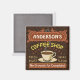 This coffee-themed square magnet is perfect for anyone who runs their own coffee shop or has a coffee theme in their home kitchen decor. Done in retro brown, orange, beige and yellow, this espresso / cappuccino inspired design features a cup on a saucer, two personalized text banners and the words "Coffee Shop / Fresh Roast / Great Flavour" in yellow.