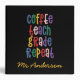 Coffee, teach, grade, repeat teacher modern colourful bright rainbow typography gift. Show your teacher you care with this useful modern Christmas or end of term gift. Very important teacher bits and bobs. With hand lettered modern fun script, and space for their name and the name of your child. The perfect end of year, Christmas or holiday gift for your favourite teacher. The colours of the text and be changed to suit.
