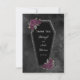 Dark and beautiful, this coffin wedding thank you design is perfect for a gothic or Halloween wedding. Coffin has grey glitter sparkle around the edges and purple roses with gold and grey green leaves. Background is a moody black watercolor. See coordinating items in our shop, Enchanted Finch.