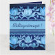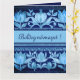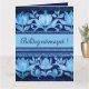 Cette grande carte de voeux, inspirée des motifs de torse de tulipe hongrois, présente un design dans les bleus foncés et clairs avec une touche rustique. La carte comprend le message "Boldog Névnapot !" qui se traduit par "Joyeux Jour du Nom". Créé en collaboration avec Magic Media AI et la créatrice hongroise Alma Wad.