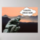 The stone statue of the thinker is set against a backdrop of a mountain range under a serene sunset. The phrase 'Cogito, ergo sum' appears in a thought bubble above the figure's head, adding a philosophical dimension. The warm colours of the sky enhance the reflective mood.The Latin cogito, ergo sum, is usually translated into English as "I think, therefore I am" is the "first principle" of René Descartes' philosophy. Who better to think it than the famous thinker statue.