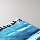 A stylized, blue monotone image of cold polar sea.. Ice hugs the coastal mountains. Customizable text reading, Alaska" also appears. Add your own additional text.