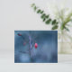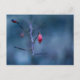 Postcard with a closeup photo of an old frozen red rose fruit, on a blue bokeh background. Customizable.