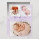 Bébé Lavande de naissance Lilac Merci photo Collage Cartes. Elégante faire-part de naissance minimaliste mignonne avec 3 de vos photos de bébé préférées sur le devant, avec un joli texte écrit à la main "merci" dans un script de calligraphie tourbillonnant avec queues d'échasses sur lavande ou arrière - plan couleur lilas. Ajoutez le nom de votre bébé sur le devant et les statistiques de naissance. À l'arrière, il y a de l'espace pour votre message de remerciement et une photo de bébé. Vous pouvez facilement le personnaliser.