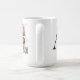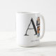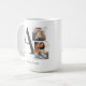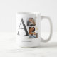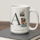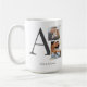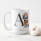 The Collaged Initial Stories coffee mug blends modern design with sentiment. A large charcoal serif initial anchors one square and one rectangular photo stacked nearby, accented with washi tape details. Names and location in charcoal text rest below on a clean white base.