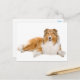 Brighten someone's day with a card! This charming postcard features a portrait of a happy tan and white Collie puppy dog highlighted against a creamy white background. She is ready to help you send greetings to family, friends and customers.
