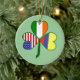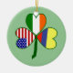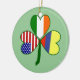 Shamrock features a flag in each leaf. United States, Ireland and Colombia are all represented. Great way to celebrate St. Patrick's Day, the 4th of July and any Colombian holidays, too. Fun for travelers who have vacationed to all three places. Design shows on green background.