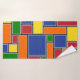 This towel set has a Bauhaus design of rectangles formed with gray lines and filled with red, yellow, orange, blue, and green on a field of black.