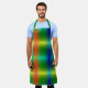 "A colorful apron with a gradient pattern in red, yellow, green, and blue is displayed. Below, a person models the apron, smiling in a light blue shirt."