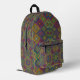Colorful backpack with front view showing vibrant geometric patterns in reds, blues, and greens. Back view reveals black straps and padded design.