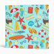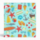 Graphics of beach vacation elements on a bright blue background, seamless repeat pattern