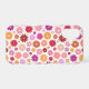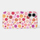 Colorful flower pattern in yellow, orange, pinks, lilac and reds on a cream color background.