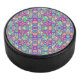 Colorful circular floral pattern with symmetrical designs featuring flowers and leaves in vibrant pink, blue, and green tones on a puck-like object.