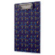Colorful clipboard featuring a dark blue background with a vibrant pattern of abstract yellow, purple, and blue shapes. Shown in front and angled left views.