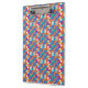 Colorful clipboard with a vibrant geometric pattern featuring interlocking shapes in blue, orange, and red. The design conveys a lively, energetic feel.