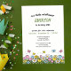 This “Our Little Wildflower” first birthday invitation is designed with a soft white background and a lively arrangement of bright, whimsical wildflowers and delicate butterflies blooming across the bottom border. The title “our little wildflower” is styled in a fun serif font, paired with your little one’s name in a bold comic font that adds a playful touch, while the party details are displayed in a matching serif font for a balanced, joyful feel. The vivid floral colors create a fresh, happy look, and the back of the card repeats the same delightful graphic for a coordinated finish. Simple to edit and customize with all your celebration details.