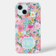 Customize this gorgeous modern colorful flower garden of flowers in pink, purple, blue and yellow iPhone 15 case with your your initials in a modern CAP font in white on blue. It's so vibrant and happy!