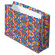Colorful geometric gift bag with vibrant patterns in red, blue, orange, and white. The design features interconnected shapes, creating a lively, festive look.