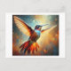 A vibrant hummingbird is captured mid-flight with its wings outstretched. The background features a lively mix of warm and cool colors.